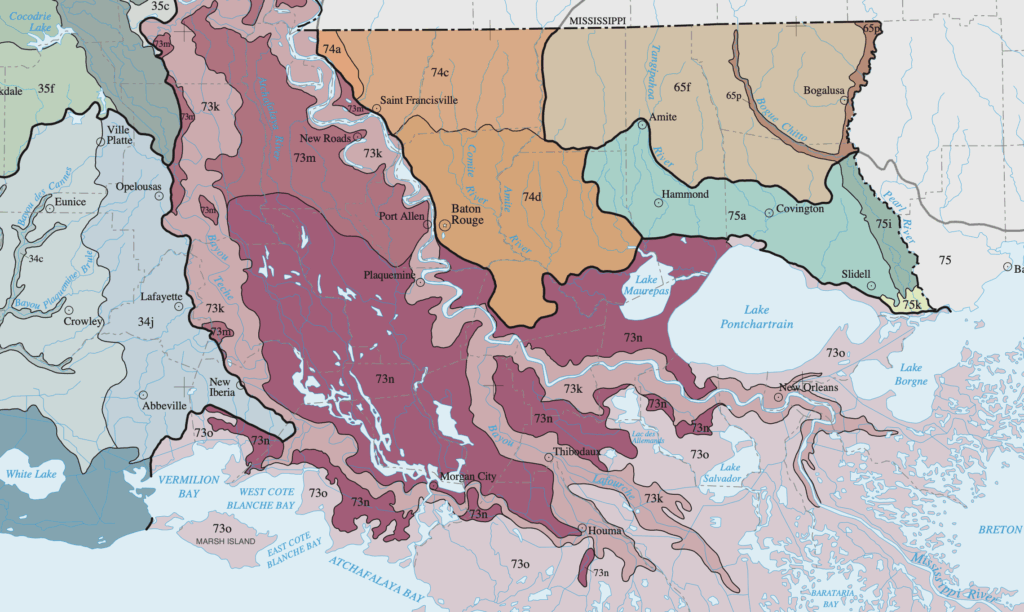 Our region is marked in orange and labeled 74c and 74d in this zoomed-in view of the Ecoregions of Louisiana. We use the ecoregion as our chapter area because our native plants and animals evolved in this very specific terrain, soils, and climate.