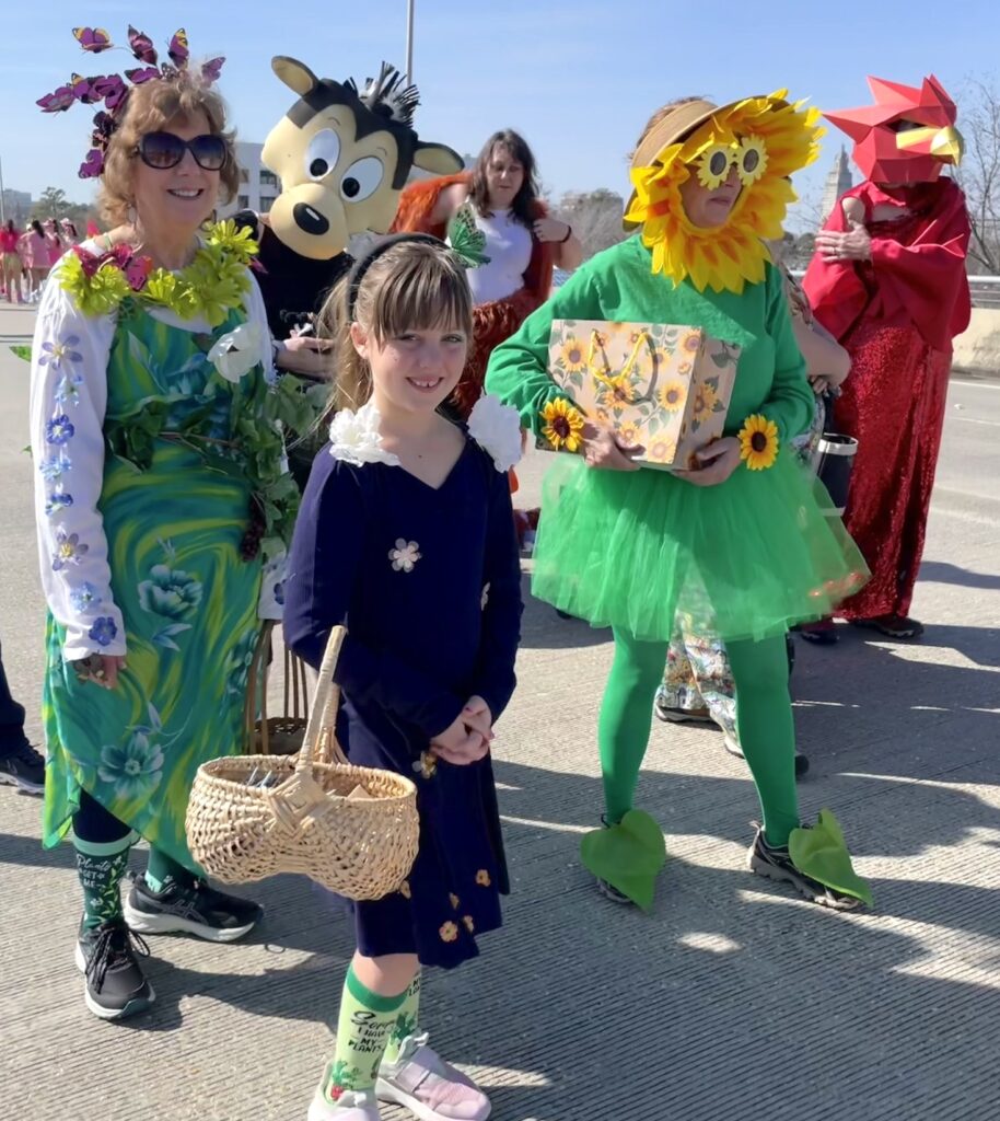 The Louisiana Master Naturalists of Greater Baton Rouge entered a walking krewe for the first time in the Mid City Gras parade. The annual event is a small, family-friendly parade in the Mid City neighborhood led by the parade mascot, Sparky the Squirrel. Participants are encouraged to avoid the traditional plastic beads and bring home-made throws to share with the crowd, such as decorated acorns and other fun trinkets. The Master Naturalists decided that handing out native seed packets would be perfect, and of course contacted the Wild Ones Greater Baton Rouge Chapter for seeds and advice. They were provided with native flower seeds from the chapter seed library, and the formatted file to print the seed packet stickers with the photo of the flower and helpful information. The Master Naturalist volunteers prepared the seed packets, and on February 8, 2026, dressed as Mother Nature, plants, and animals, gave the seed packets to eager parade watchers . The reception was wonderful and people were excited to receive them!