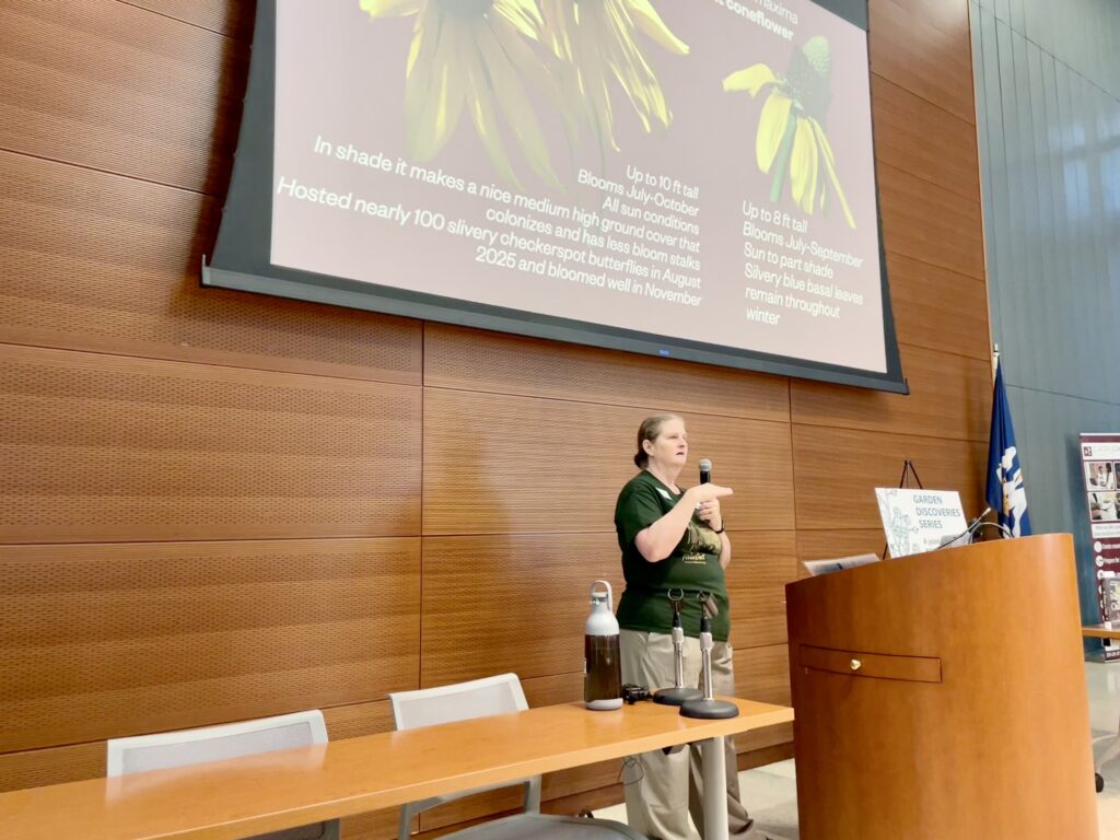 As part of the Re-Wild the Library event, the Baton Rouge Botanic Garden Foundation hosted their free monthly Garden Discoveries event, which featured a presentation by Janine Kharey, President of Wild Ones Greater Baton Rouge, titled, “What You Plant Can Make a Difference.” The presentation highlighted the importance of native plants and keystone species and how they are the foundations for healthy ecosystems. The audience was well engaged and even gasped aloud when Janine told them that she has fireflies in her urban backyard. Fireflies are extremely rare in Baton Rouge due to habitat loss, lack of knowledge about their life cycles, and extensive mosquito spraying programs. Immediately after the presentation, participants went on a tour of the Baton Rouge Botanic Gardens adjacent to the library.