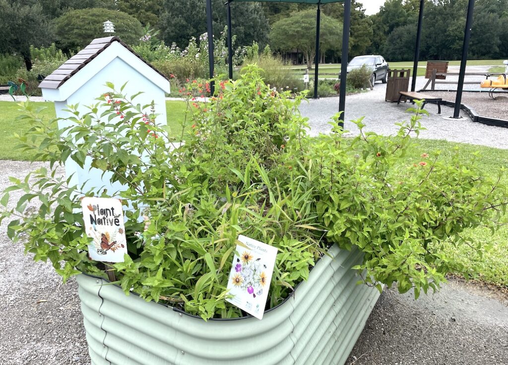 The Wild Ones Greater Baton Rouge chapter held its first Wildflower Walk today along the trails of the LSU AgCenter Botanic Gardens at Burden. The blooms that were putting on a particularly flashy show were in LSU purple and gold, like the Tall Ironweed that was being visited by bumblebees, and pops of gold from Mexican Primrose Willows and Oppositeleaf Spotflower that were feeding tiny, native bees. We also visited the Wild Ones native plant display gardens in the Children’s Garden. The native plants look amazing, even in this summer heat!
